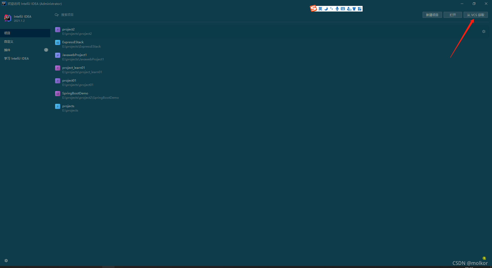 1、打开IDEA,在选择项目时,点击从VCS获取
