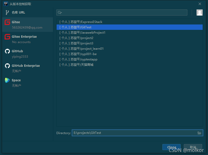 2、选择自己的git账号,选择对应的项目,以及要放置的目录,点击Clone