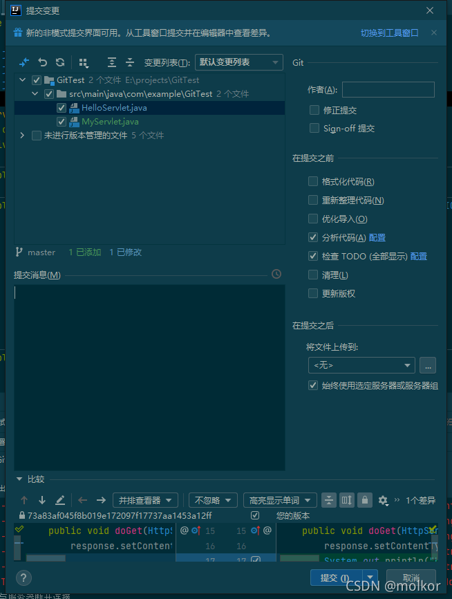 3、修改完成后,改动过的代码,会变成蓝色,新增的代码,是绿色。然后点击提交按钮
