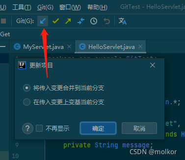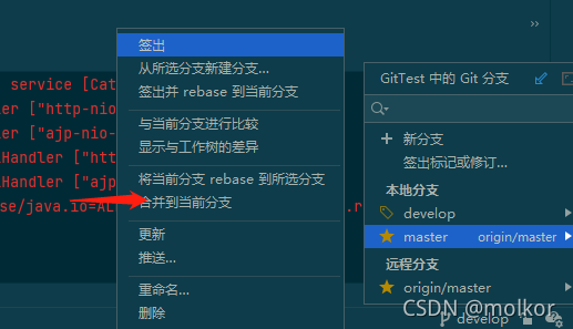 再切回自己的分支,在右下角,选择主分支,点击合并到当前分支,最后再点击推送。