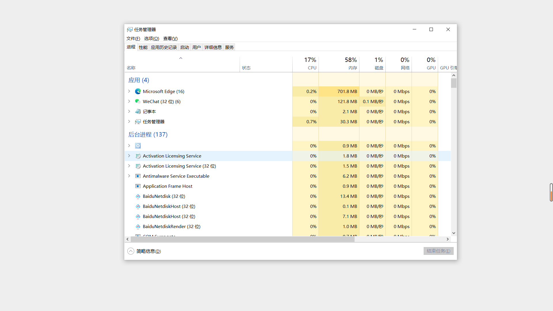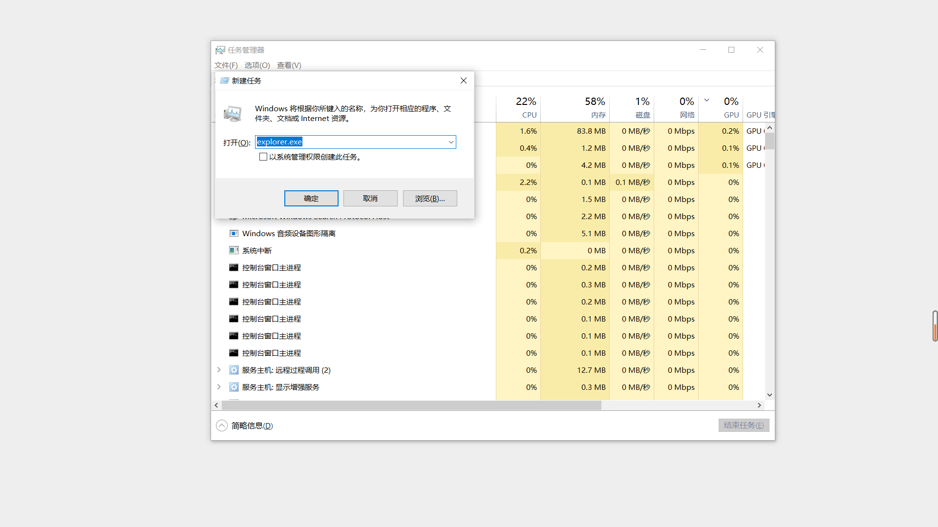 我现在遇到的问题是这样的:因为资源管理器的进程被”结束任务“了,导致电脑白屏