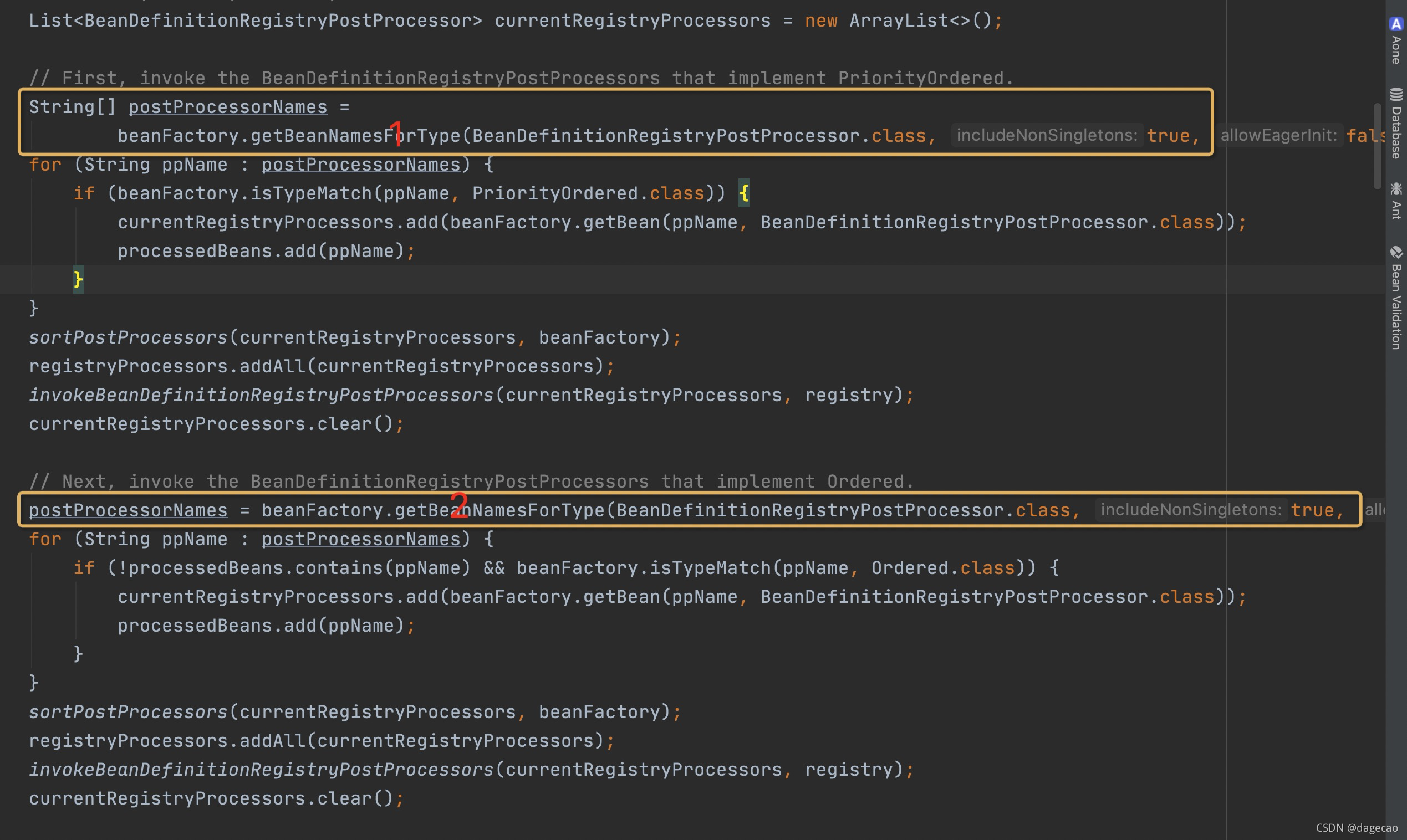 这里Spring会两次调用获取BeanDefinitionRegistryPostProcessor类型的Bean名称并实例化Bean