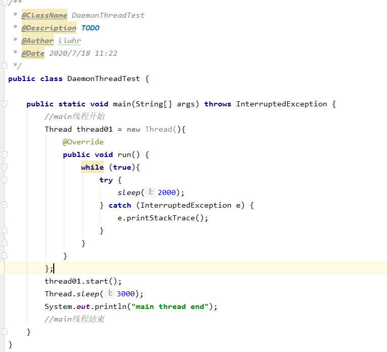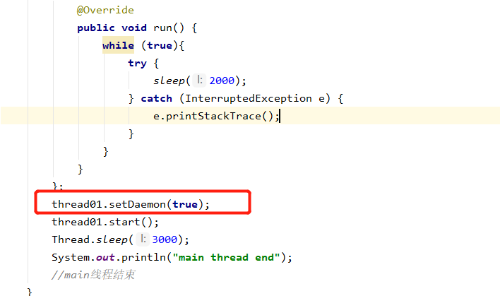 上面的demo中,即使main线程结束了,JVM程序也不会退出,因为thread01线程还在不停的运行。但是如果我们把thread01设置为守护线程,那么当main线程结束后,JVM会退出,因为这时候没有非守护线程还在运行。如下: