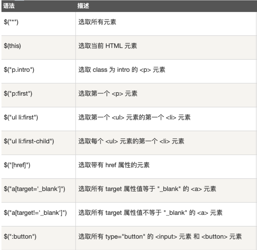 jQuery的选择器与CSS3中的选择器几乎完全一致,这里就不再赘述。总体梳理: