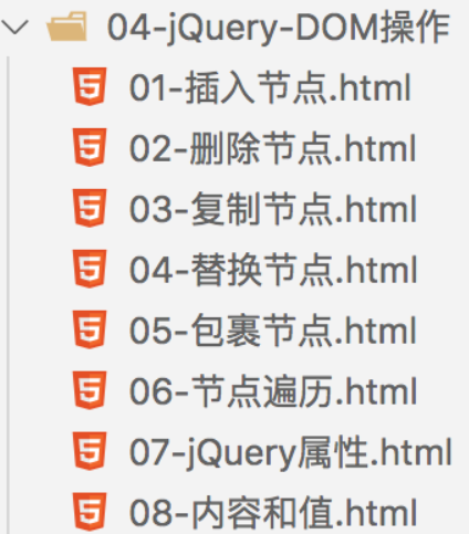 jQuery中提供了一系列的操作DOM节点的api,用于解决DOM原生API无法进行批量操作并且功能性较差的弊端。 插入方法:append、appendTo、prepend、prependTo、after、before、insertBefore、insertAfter 包裹方法:wrap、unwrap、wrapAll、wrapInner、 替换方法:replaceWith、replaceAll 移除方法:empty、remove、detach 克隆方法:clone