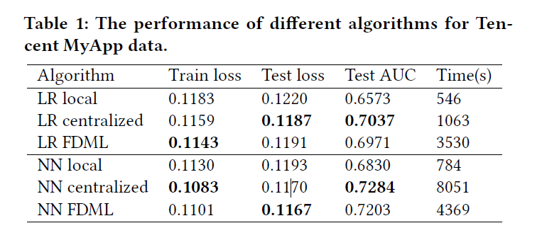results : FDML AUC、loss 效果接近于centralized training (后者model更复杂)