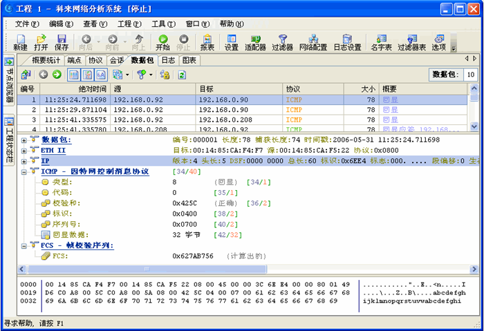 (图1 科来网络分析系统抓取的ICMP回显报文)