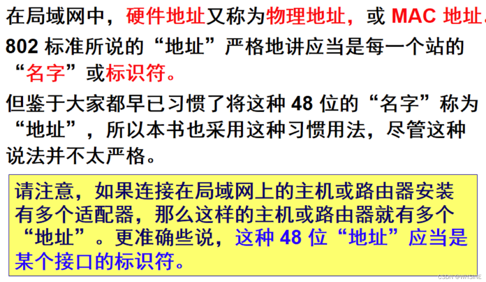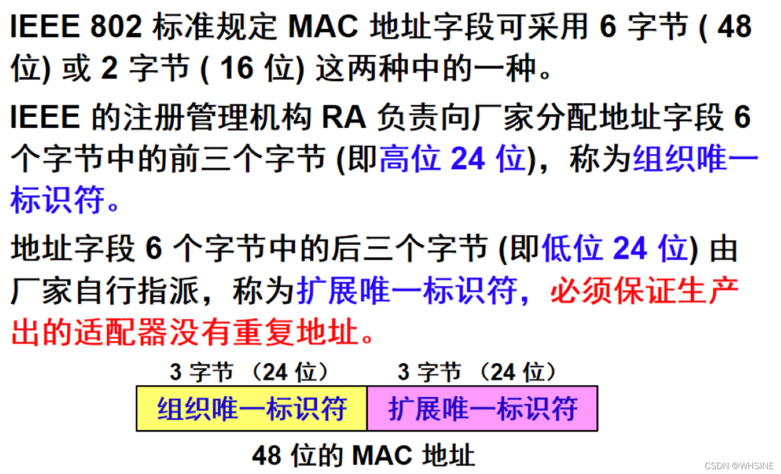 生产适配器时,6字节的MAC地址就已经被固化在适配器的ROM,因此,MAC地址也叫做硬件地址或物理地址。”MAC地址”实际上就是适配器地址或适配器标识符EUI-48。