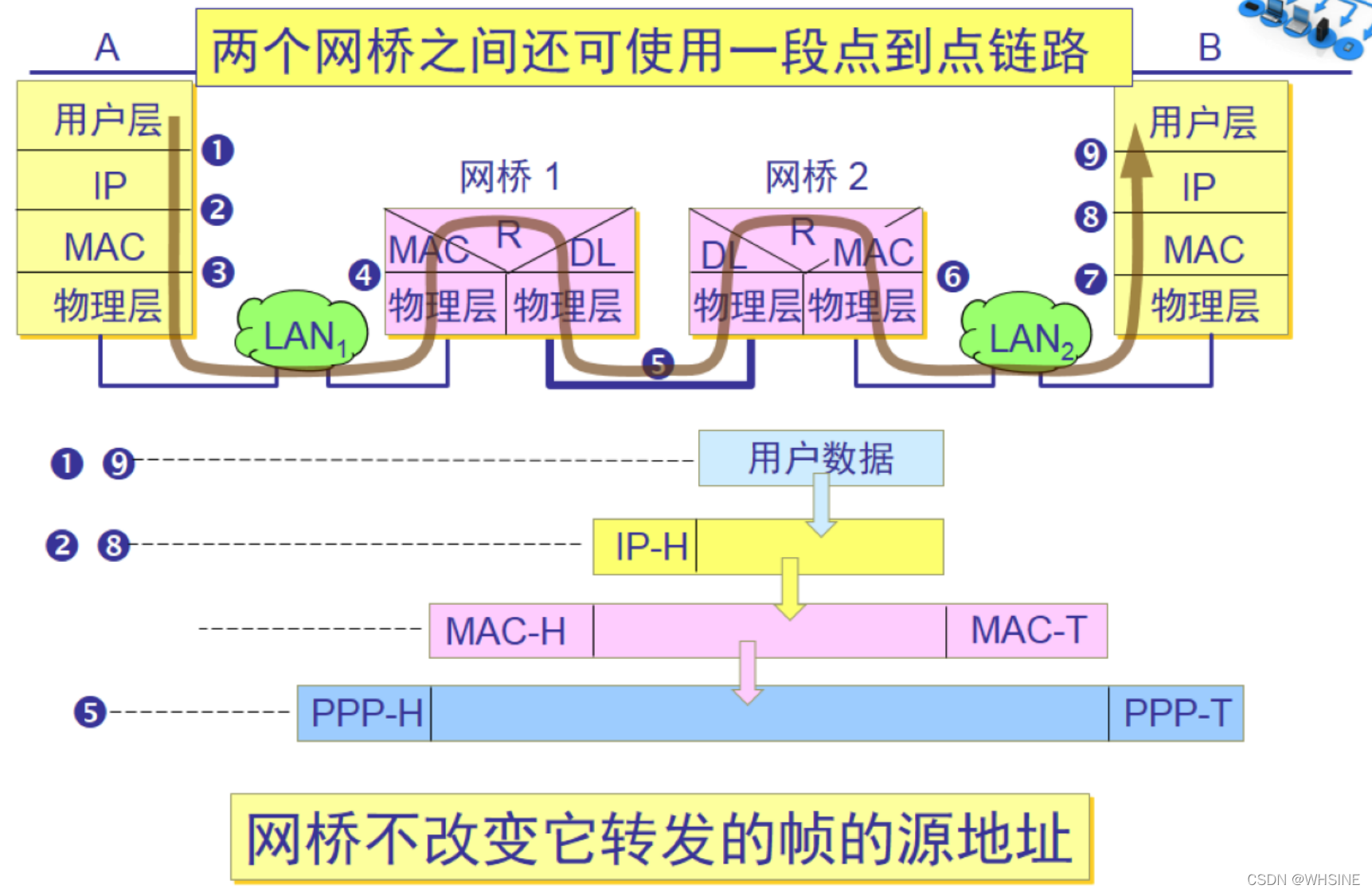 两个网桥可以使用一段点到点链路,即将MAC帧封装到PPP帧当中