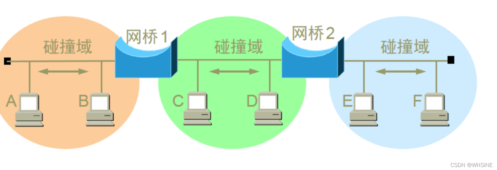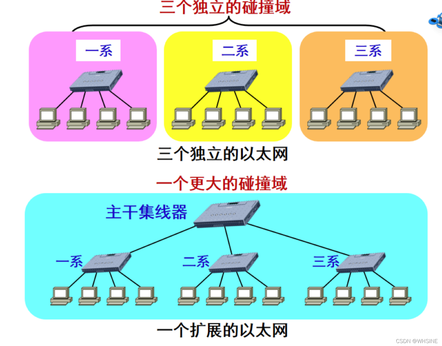由于集线器相当于是一个逻辑上的共享总线(共享信道),用集线器连接的以太网会产生一个更大的碰撞域