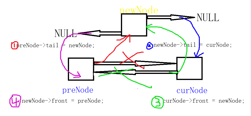 curNode->front = newNode;//后一个节点的前指针指向新节点