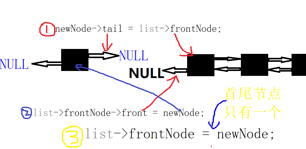newNode->tail = list->frontNode; //先创建的节点的尾部指向列表的头节点