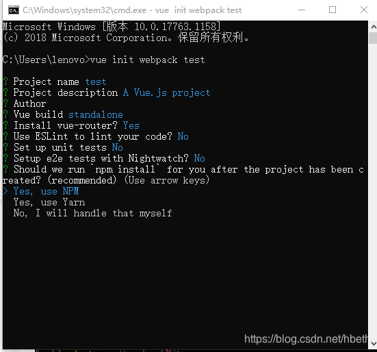 cmd中输入cd test和npm run dev加入依赖,启动工程