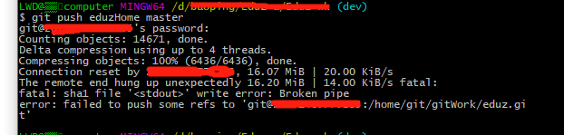 在一次git提交远程库时候,发现代码上传一部分就突然爆出fatal: sha1 file '<stdout>' write error: Broken pipe错误。