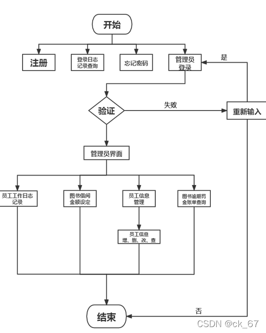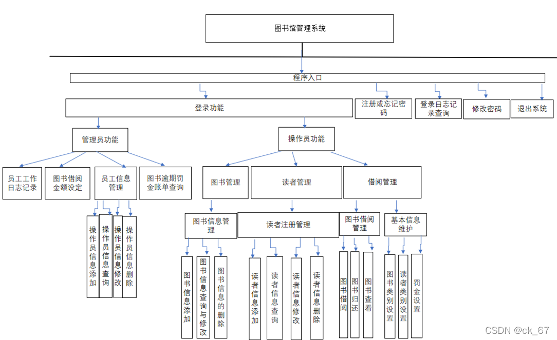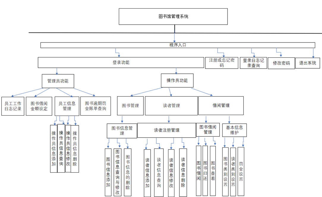 管理员模块:管理员主要包含四大基本功能:员工工作日志记录(记录了每个操作员的登录时间和各种操作信息,日志可通过I/O流放在相对应的文件里),图书借阅金额设定,对操作员信息进行管理(增删改查),图书逾期罚金总账单查询(该账单记录了所有预期的图书的逾期金额明细和最后图书馆所有书的逾期总金额数)。