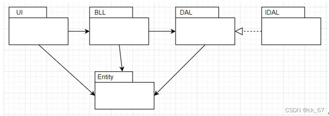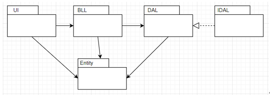 包图说明:本系统基于五层架构,分为界面层(UI)、逻辑层(BLL)、数据处理层(DAL)、接口层(IDAL)、实体层(Entity)。前面三层都需要引用实体类,因为需要通过实体层来传递参数,数据处理层需要引用一个SQLHelper的助手类。