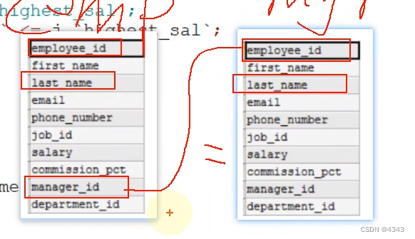 WHERE emp1.`manager_id` = emp2.`employee_id`相当于两个emp表合并在一起,合并的条件是emp1中的manager_id与emp2的emp_id相等。合并的新的表有20个字段(10+10)