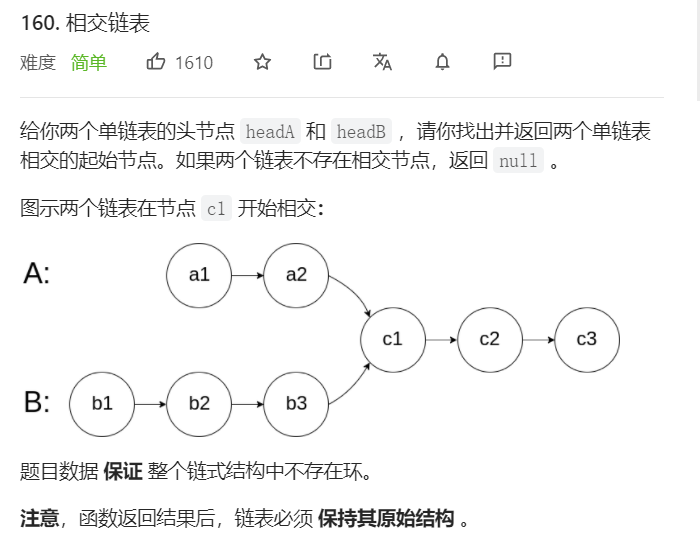 - 同时等速遍历两个链表,判断是否为同一个节点。