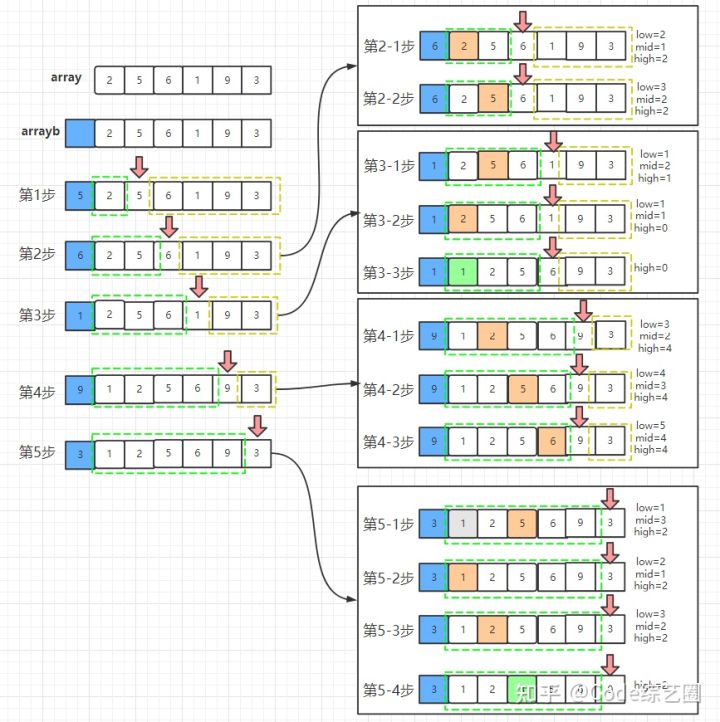 图中绿线框部分代表是已经排好序的列表,箭头指的元素是下一个待插入的元素,黄线框部分为剩下的无序元素。黄方块为每次折半查找到的mid位置,绿方块表示最后有序列表腾出的位置。