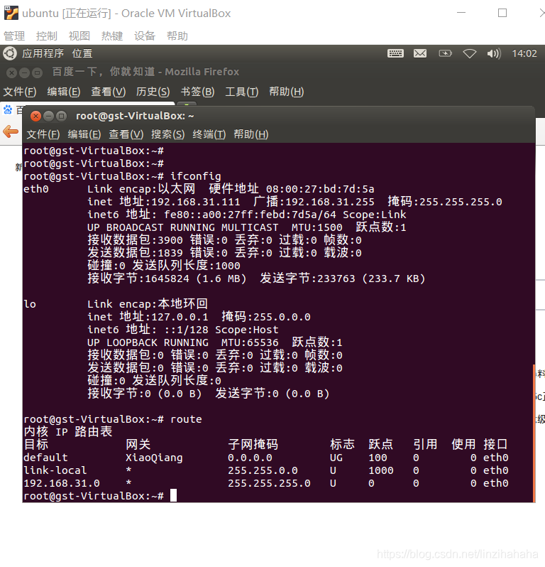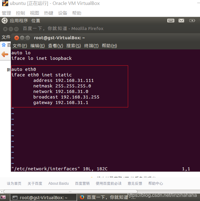 4,修改ubuntuIP配置,修改成符合无线网络的网关,sudo vi /etc/network/interfaces
