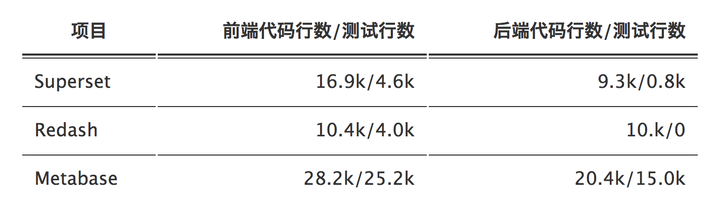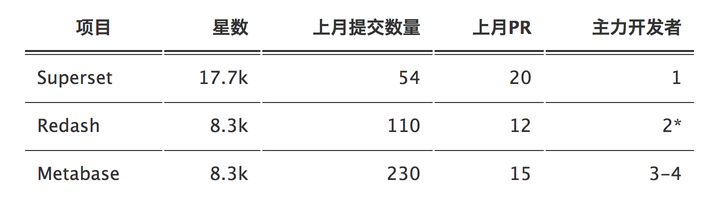 我们可以用类似的方法分析 Redash 与 Metabase 这两个项目,三个项目的总体情况在下表中