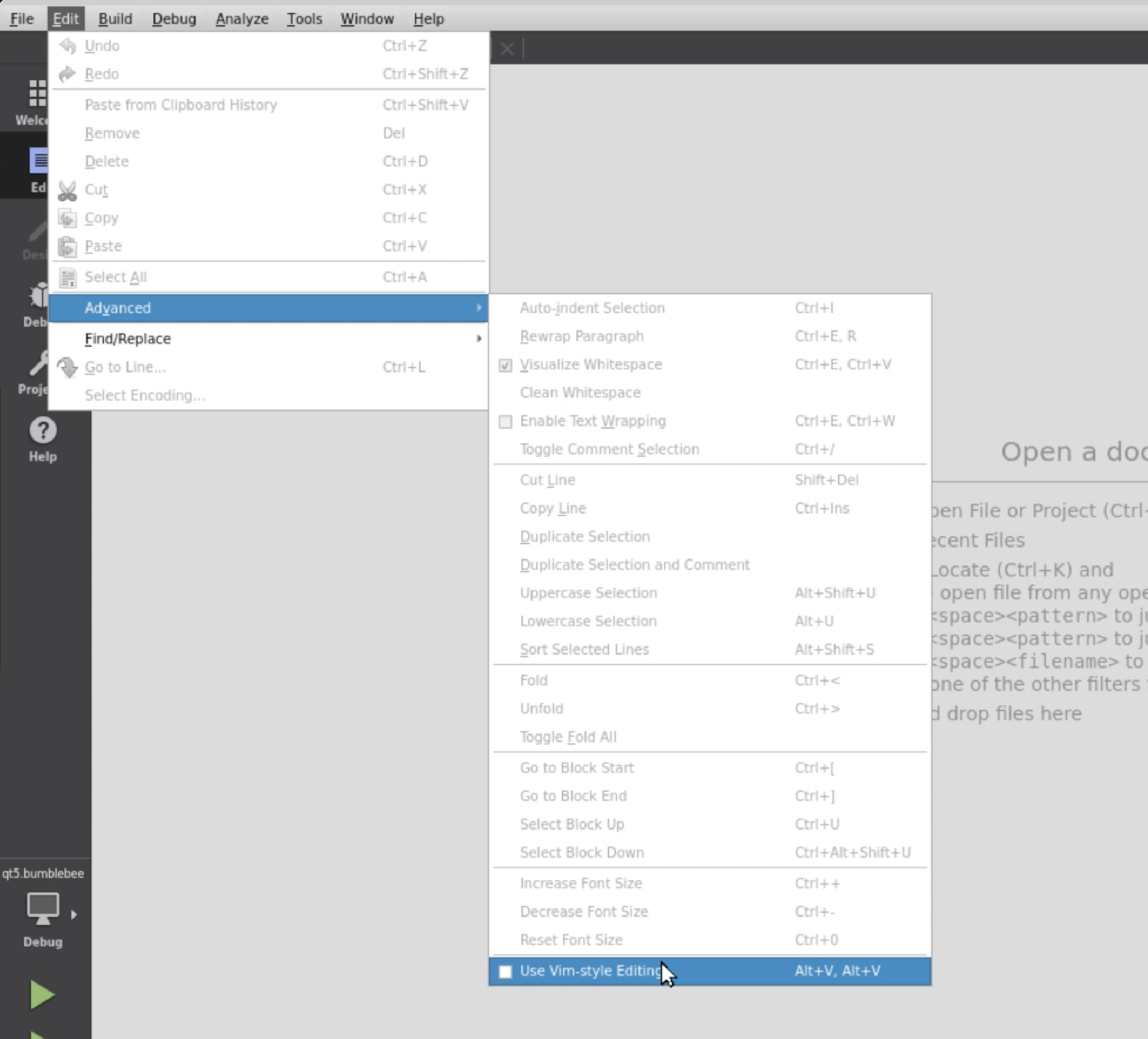 解决:在qt creator的header bar点击Edit->Advanced,找到Use Vim-style Editing,取消选择