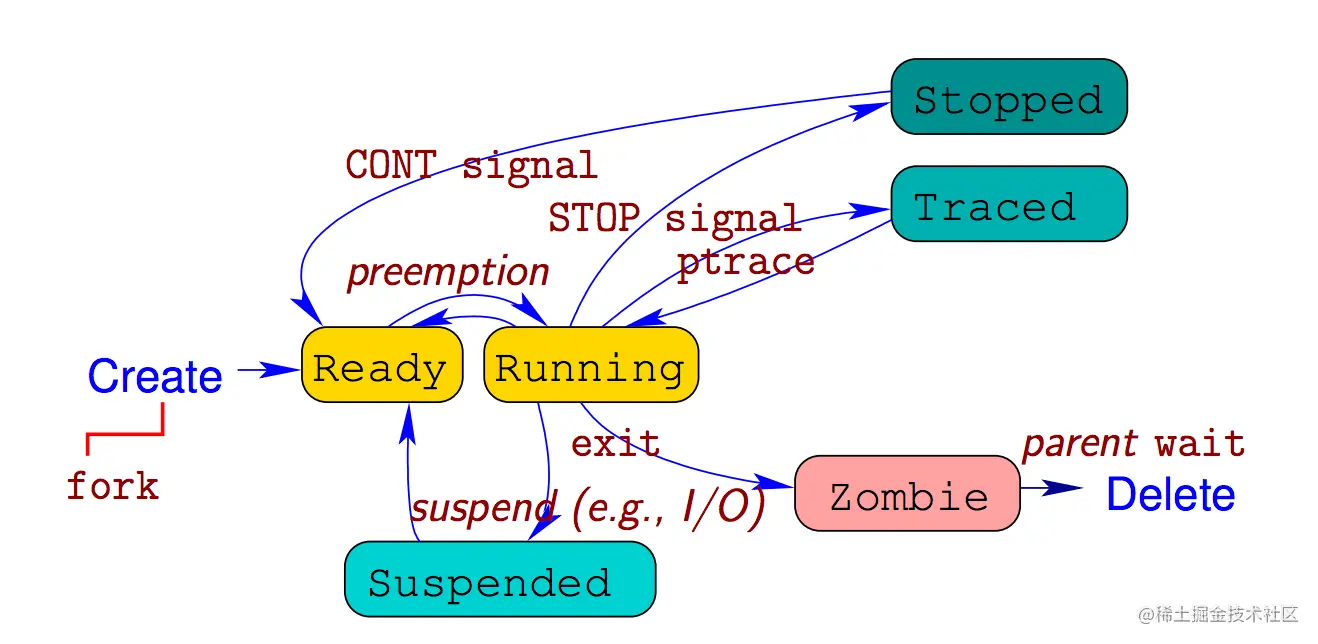 Ready,当进程被创建完成之后他就处于Ready状态,在这个状态下的进程只差CPU了,也就是说,他现在只需要被操作系统调度获取CPU然后他就可以执行了。Running,当进程从Ready状态获取CPU的执行权的时候,进程就处于Running状态,这个状态表示进程正在执行。traced,这个状态主要是一个进程处于调试状态,这个状态需要调试的进程给这个被调试的进程发送信号,然后和这个进程才可以继续执行。Zombie,当进程执行完成之后,父进程接受子进程发送的信号之前,进程就处于这个状态。Suspended,这个状态表示进程被挂起,当进程请求IO的时候,需要阻塞等待IO请求完成,这个时候的进程状态就是Suspened状态。