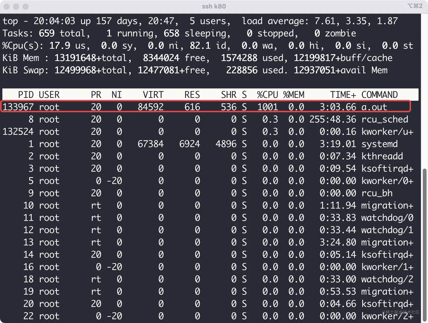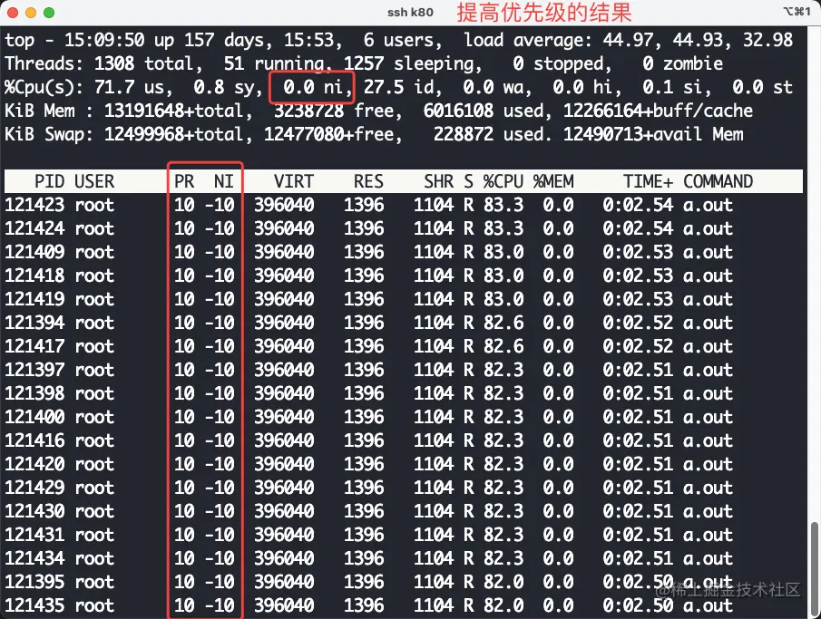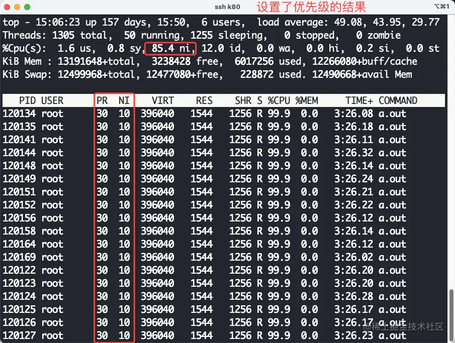 us,运行没有指定优先级的用户进程所消耗的CPU时间所占百分比,默认的终端执行的程序都是没有指定优先级的,我们可以使用nice这个命令来改变程序执行的优先级:sudo nice -n -10 ./time。sy,运行内核进程所消耗的CPU时间所占的百分比。ni,运行指定了修改过优先级之后的用户进程所占的CPU时间百分比。这里可以结合PR和NI两个字段进行分析,我们现在执行sudo nice -n 10 ./a.out命令,在./a.out当中我启动了10个死循环的线程,我们来看一下它的top输出结果: