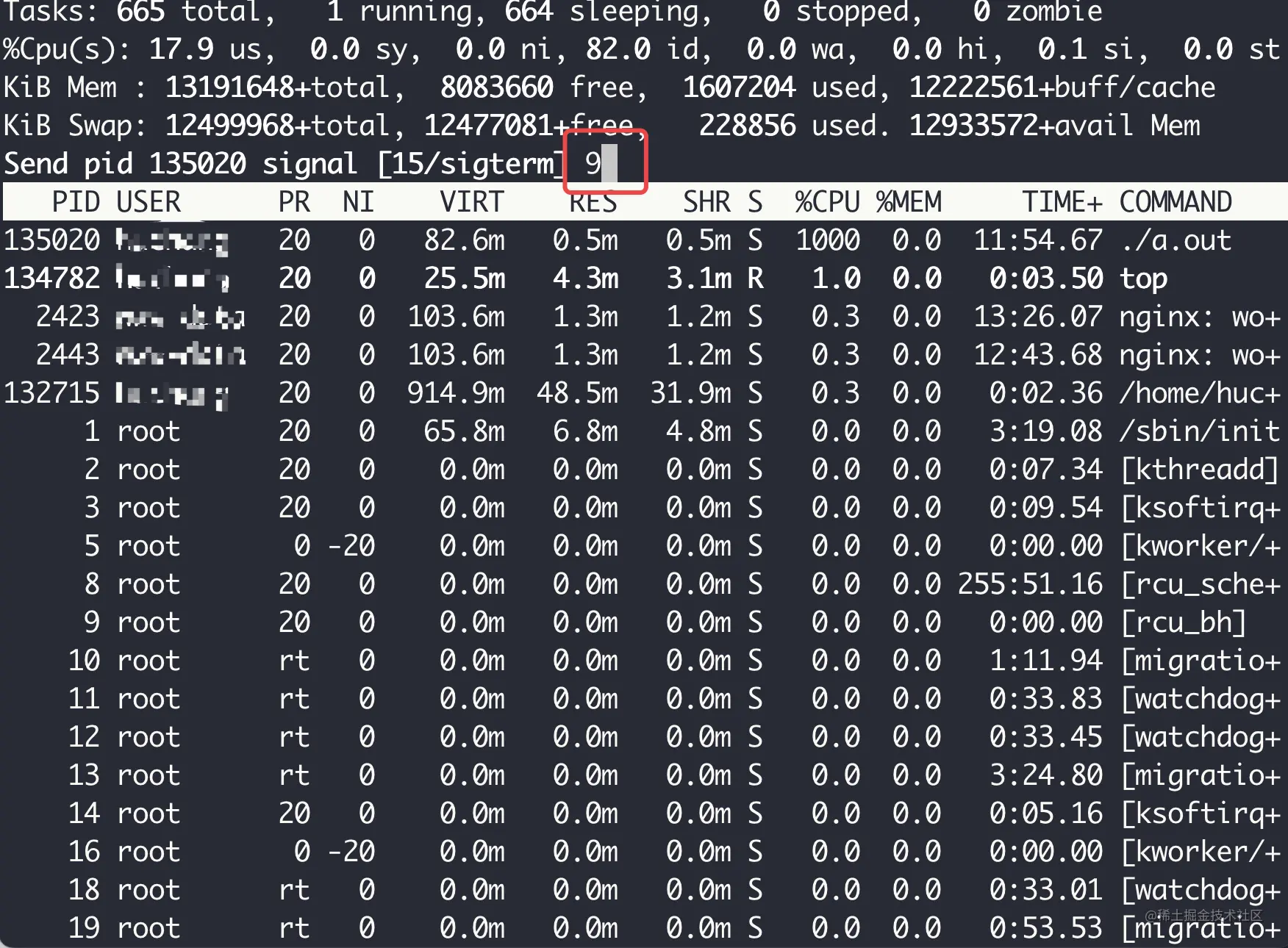 我们先在交互模式下先按下键盘上的k,然后输入进程号,然后输入回车,再输入想发送的信号类型。
