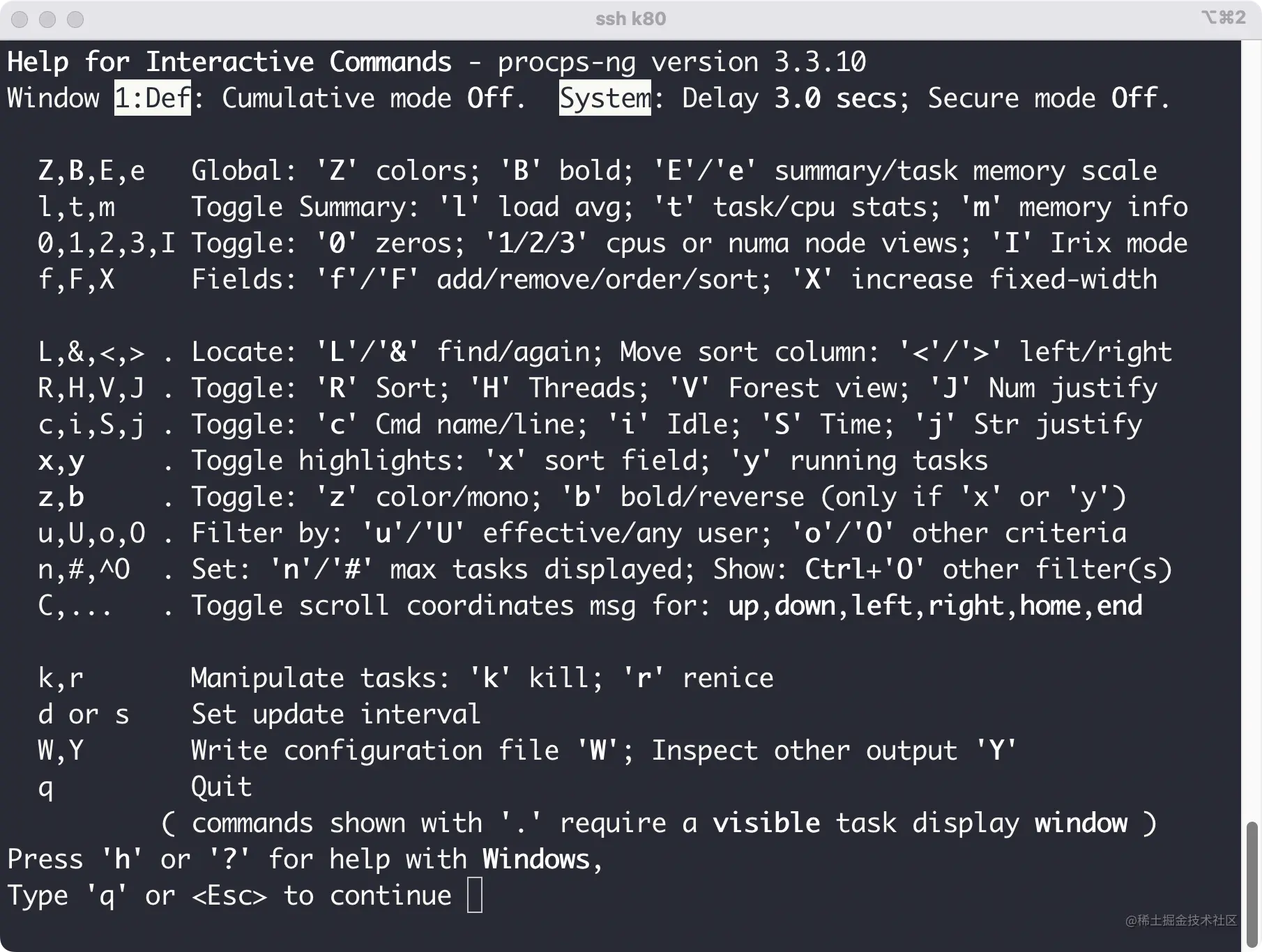 i,过滤掉CPU利用率很低的进程,很多时候我们在进行系统分析的时候需要去判断那个进程CPU占有率高,因此i是一个非常有效的方式过滤掉干扰进程。
