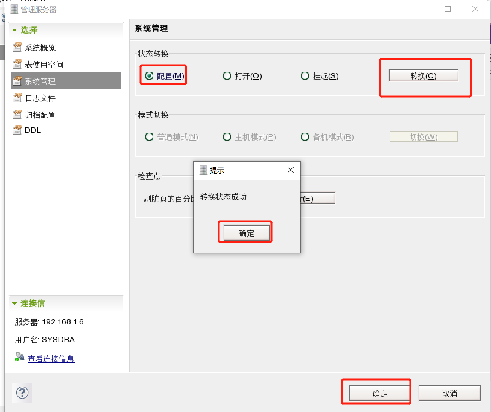 管理服务器点击后可以看到如下选项,点击系统管理→状态转换(配置)→转换→确认→确认
