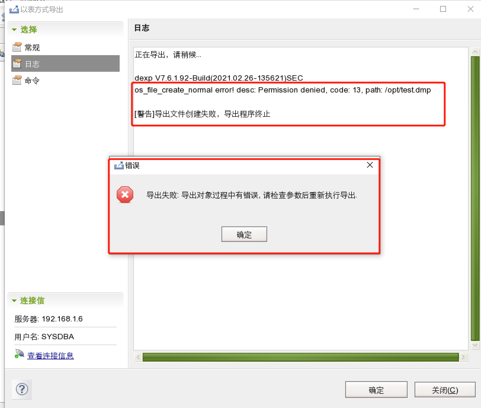 处理方法:根据报错分析是创建dmp文件失败导致的,文件创建失败一般都是权限不够导致的,所以查看目录权限
