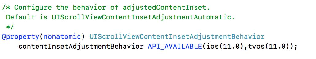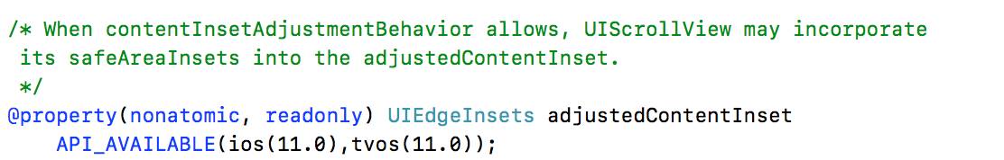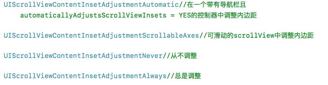 如果 UIScrollView 需要调整内容边距则加上安全区域的偏移,即 adjustedContentInset = contentInset+safeAreaInsets,如果不调整则 safeAreaInsets 不参与到计算中,即 adjustedContentInset = contentInset。简而言之,contentInsetAdjustmentBehavior 就是告诉 UIScrollView 在计算 adjustedContentInset 时要不要加上 safeAreaInsets。