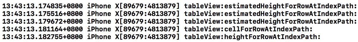 UITableView 除了继承自 UIScrollView 的特性外,还有自身 API 的变动。新系统中,UITableView 开启了估算行高,estimatedRowHeight、 estimatedSectionHeaderHeight、estimatedSectionFooterHeight 不再默认是 0,而是 UITableViewAutomaticDimension(这个值打印输出是 -1),这一举措旨在帮助开发者提高性能,减少 heightForRowAtIndexPath: 方法的的调用次数,但是这样会导致 API 执行顺序发生变化。在没有开启估算行高之前 tableView 总是先执行: