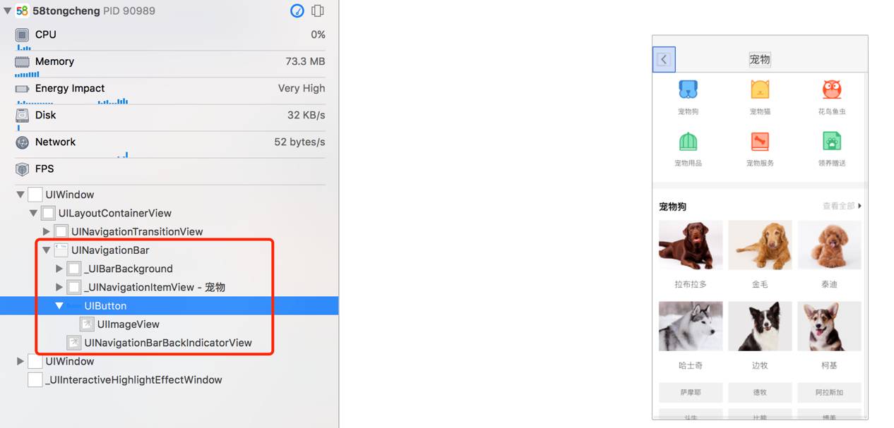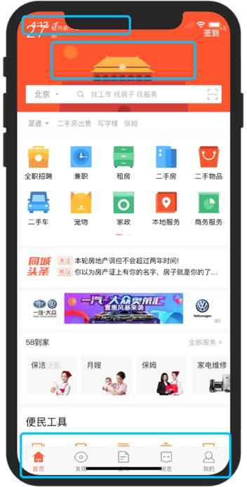 适配 iPhoneX 首先要添加一个 1125x2436 的启动图,否则会在屏幕的上方和下方留下两道黑框。在适配开始前先简单介绍下 58 同城 iOS 客户端的页面结构,因为页面结构不同可能遇到的问题会不尽相同。58 同城 iOS 客户端的 key window 的 rootViewController 是一个导航控制器,而不是 UITabBarController。导航控制器的 rootViewController 是一个 UITabBarController 样式(非 UITabBarController)的 ViewController。了解了应用的结构之后,下面介绍下 58 同城 iOS 客户端适配过程中遇到的比较典型的问题: