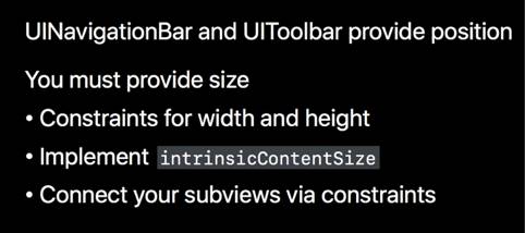 iOS11 UIKit’sBar 改动很大,对现有的应用来说 UINavigationBar 的 titleView 适配应该是最大的问题,LargeTitle 虽然看起来似乎是很大的改动,但是实际上对现有的应用没有太多的影响。iOS11 之后 UINavigationBar 和 UIToolbar 支持 Auto Layout ,开发者必须要提供自定义视图的 size。如果自定义 titleView 中使用了 Auto Layout,那么通过设置自定义 titleView 的 frame 的方式来设定 size 在某些场景下可能就不再合适了,开发者应该着重注意下自定义 view 内部的约束(具体案例将在下文中阐述)。如图 1 所示,我们可以通过以下三种方式来提供 size: