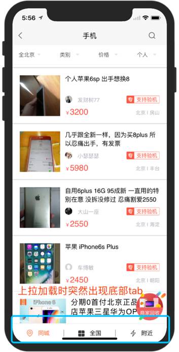 在适配过程中,我们发现在二手物品列表,上拉加载数据时底部自定义的 tabBar 会来回反复地进行显示隐藏,tabBar 为下图蓝框内区域,如图 10 所示: