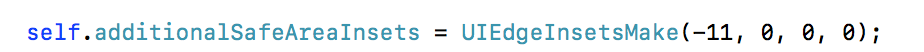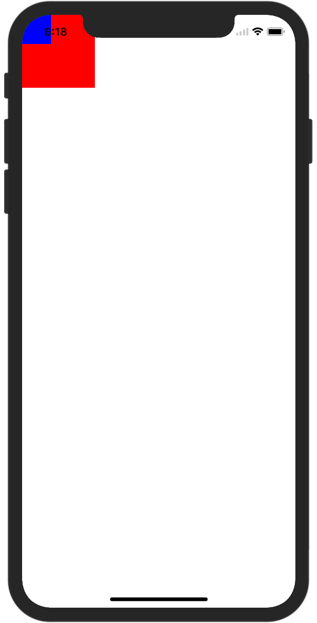 红、蓝 view 是父子视图的关系,且蓝色子视图完全在红色视图内,由于红、蓝两个 view 顶部超过安全区域 44 点(状态栏 44 高度),所以它们的 safeAreaInsets 都为 {44, 0, 0, 0},也就是说在同一个控制器中,他们的安全区域是一致的,与视图层级无关。在一个控制器中,安全区域并不是固定不变的,可以通过 ViewController 的 additionalSafeAreaInsets 方法来修改页面的安全区域,如果此时将安全区域上延 11 个点。
