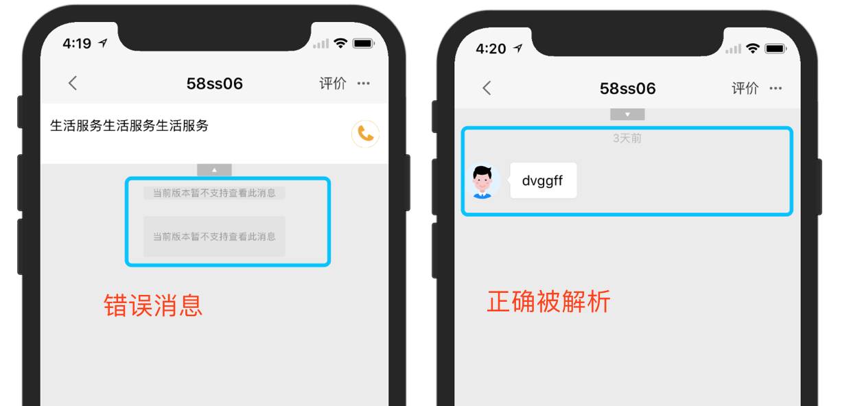 在使用 iOS11 beta 版时我们发现 IM 会话页的很多消息都变成了未识别消息类型,图 13 中左侧为适配前效果,右侧为适配后效果: