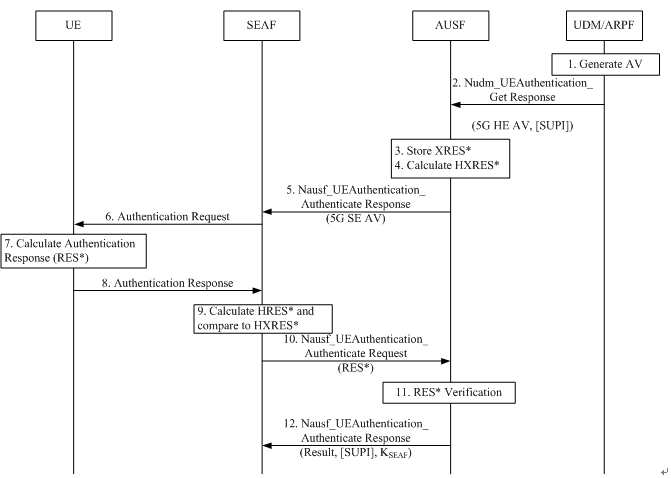 AUSF 删除KSEAF,并在Nausf_UEAuthentication_Authenticate Response消息中向AMF返回5G SE AV (RAND, AUTN, HXRES*) 。