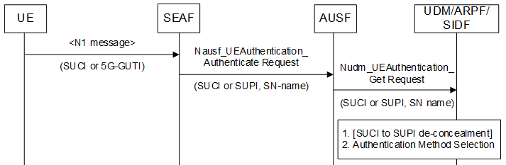 该消息用于AUSF请求UDM为UE选择一种鉴权方法,并计算新的鉴权向量(如果该鉴权需要鉴权向量的话)。如果请求中包含的是SUCI,UDM收到该请求后,首先,SIDF将SUCI解密为SUPI,之后根据SUPI为UE选择鉴权方式。目前,5G使用的鉴权方式有两种:EAP-AKA’ 和5G AKA。