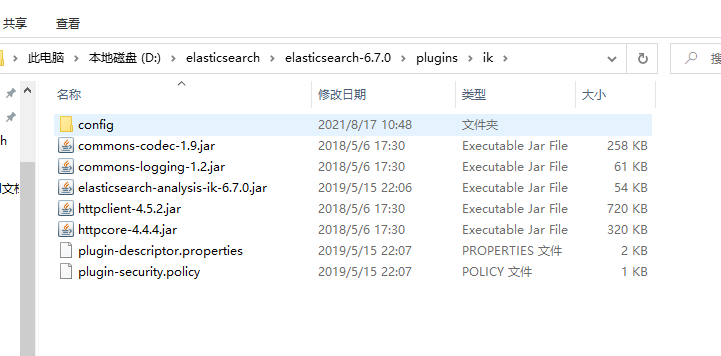 第二步:在D:\elasticsearch\elasticsearch-6.7.0\plugins下新建ik文件夹,将对应版本的分词器解压到改文件夹下,如图: