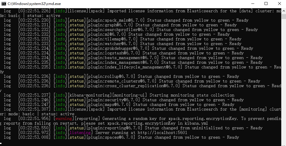 [listening] Server running at http://localhost:5601,表明kibana已经成功启动,并且监听本机的5601端口