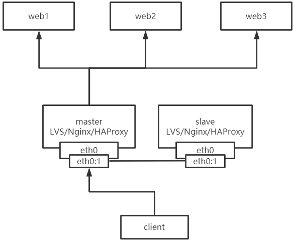 如下图所示,LVS/Nginx/HAProxy实现负载均衡(LB:load balance)功能,keepalived实现高可用(HA:High Availability)功能。
