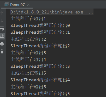 在主线程与SleepThread类线程中分别调用了Thread的sleep(500)方法让其线程休眠,目的是让一个线程在打印一次后休眠500毫秒,从而使另一个线程获得执行的机会,这样就可以实现两个线程的交替执行。