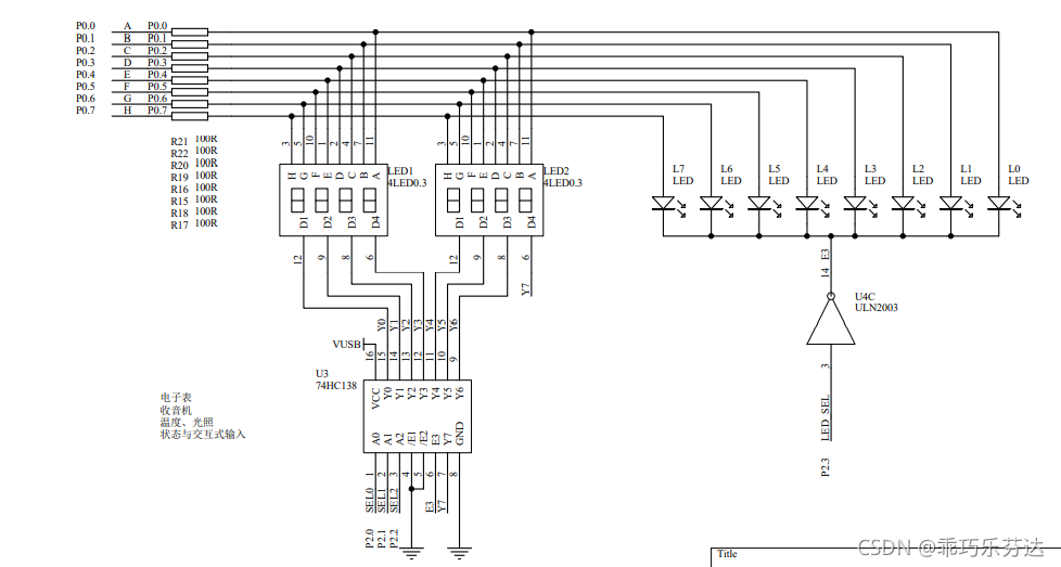 通过原理图,我们可以知道,数码管和led灯存在公用的线路。要使led灯能发亮,P2.3引脚就要置“1”,但是P2.3引脚为“1”时,数码管是不能正常显示的,所以要使数码管正常显示,要对P2.3引脚置“0”。