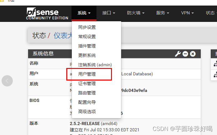 pfsense在首次登录时候默认的密码为admin pfsense。一般情况用户在登录以后会根据引导修改密码:但是后期需要在修改密码的时候有部分同学一时难以找到修改的地方: