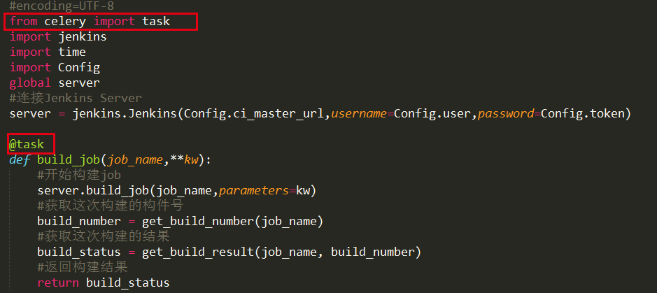 在tasks.py中我们就可以编码实现我们需要执行的任务逻辑,在开始处import task,然后在要执行的任务方法开头用上装饰器@task。需要注意的是,与一般的.py中实现celery不同,tasks.py必须建在各app的根目录下,且不能随意命名。