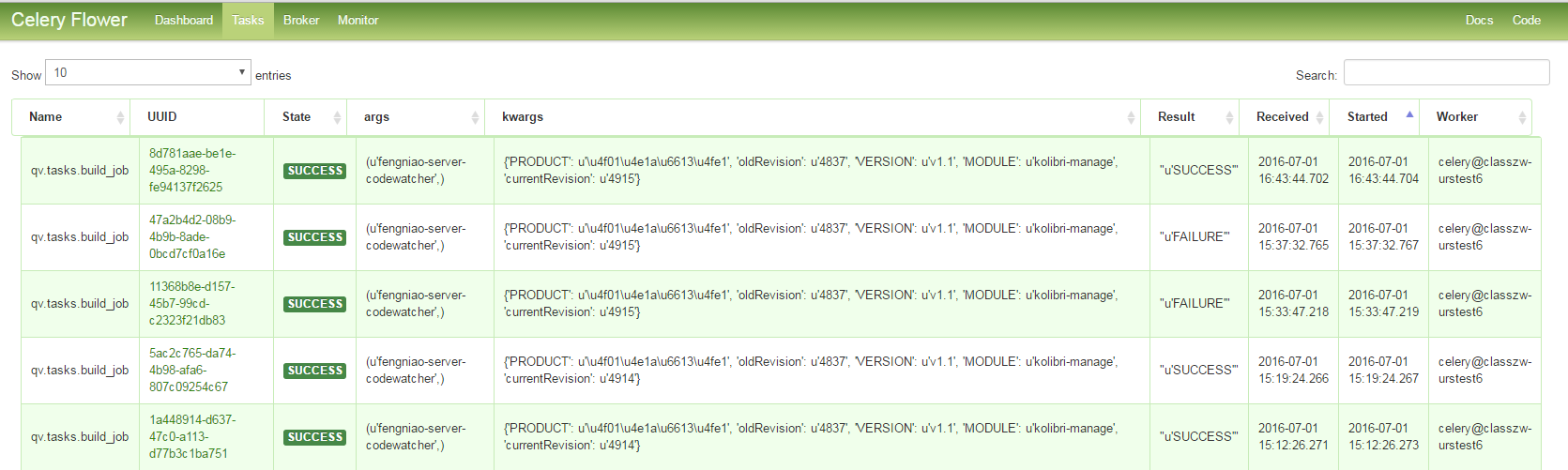 另外,Celery提供了一个工具flower,将各个任务的执行情况、各个worker的健康状态进行监控并以可视化的方式展现,如下图所示: