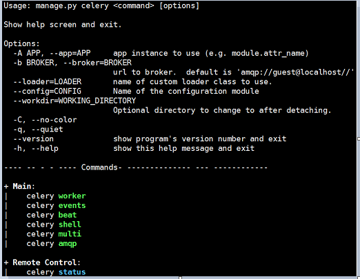 Django下要查看其他celery的命令,包括参数配置、启动多worker进程的方式都可以通过python manage.py celery --help来查看: